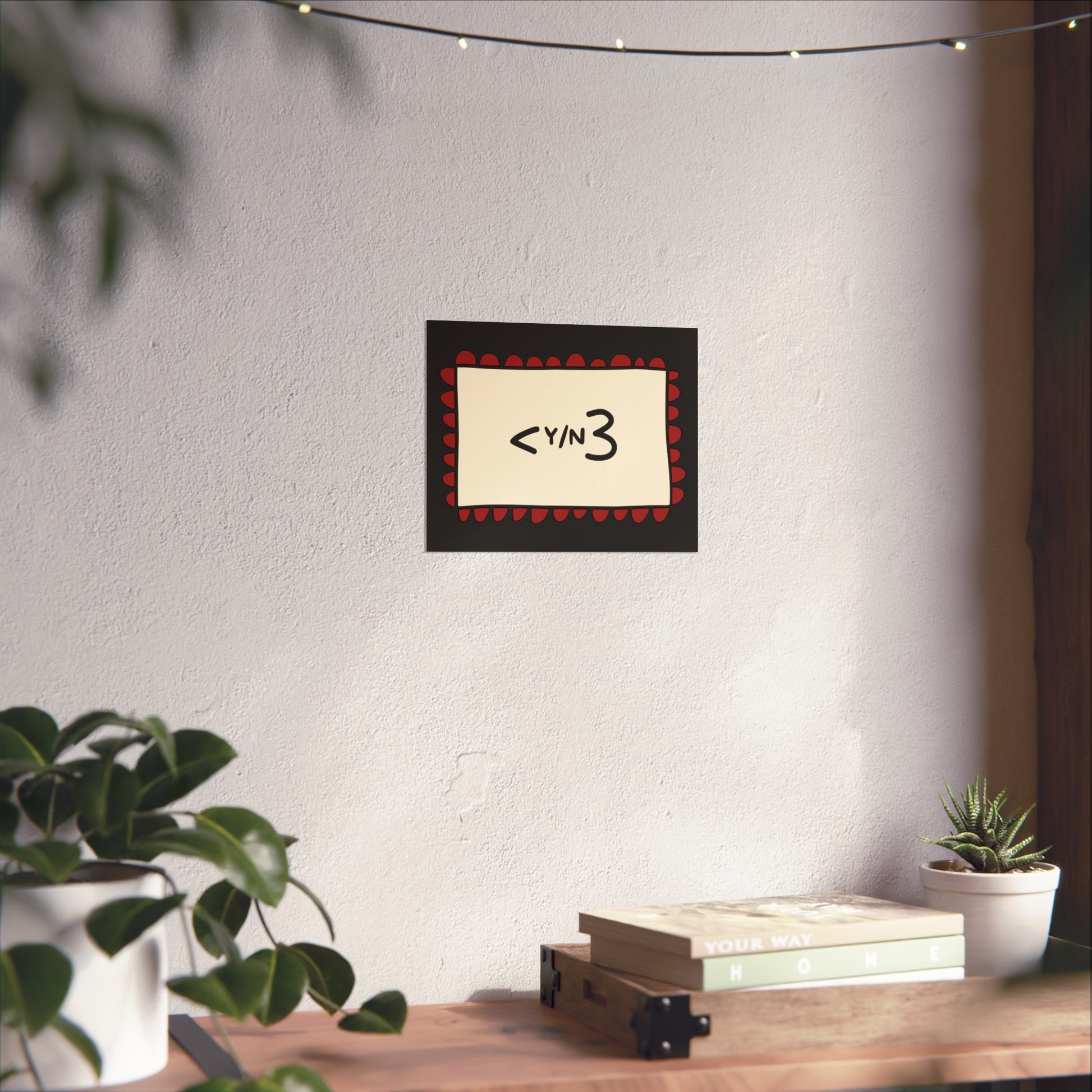 Make a bold statement with our exclusive Y/N Fanfic & Tattoo Inspired Fine Art Poster! Designed and printed in the UK by Chart Attack Studio, this unique poster merges the worlds of fanfiction, internet and tattoo culture, featuring the iconic <3 Y/N text design. Whether you're a fan of the 'fics or simply love bold, homely art, this poster brings that emotional, lighthearted spirit to life. With striking text that speaks to the heart of romantic storytellers, this poster is perfect for anyone who embraces love and doesn't shy away from making a statement.